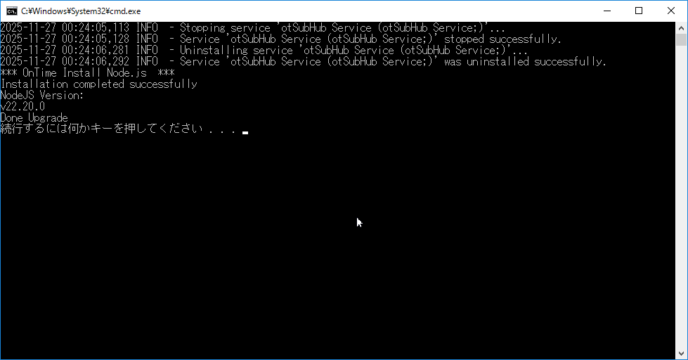 続きOnTime同期ハブのプログラムがインストールされます。最後にサービスマネージャにも登録されたメッセージが表示され終了です。何かキーを押してcmd.exeのウィンドウを閉じてください。