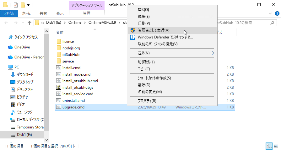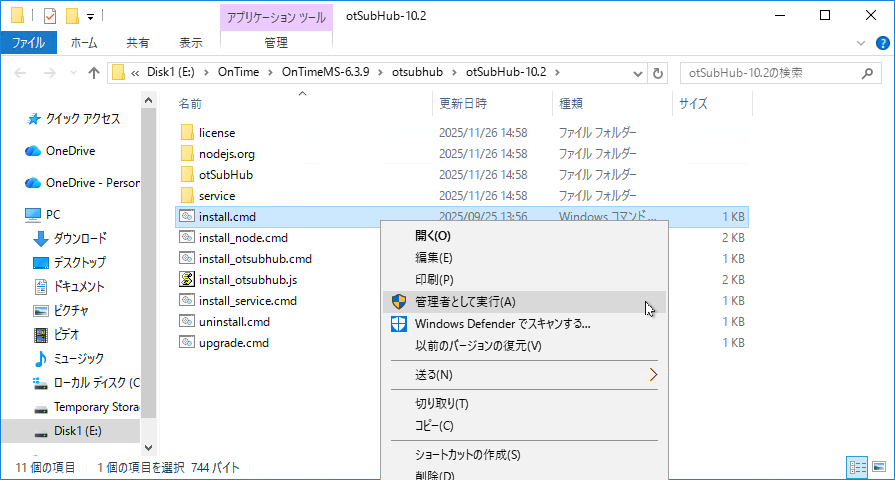 インストールの場合は、「install.cmd」をマウス右ボタンメニューから「管理者として実行」をクリックしてください。