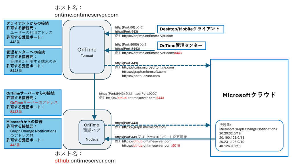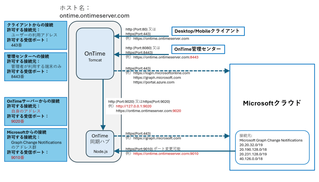 | 送受信 | OnTimeサーバーからOnTime同期ハブ | HTTP HTTPS 注2) | 9020 変更可 | 自身 | ローカルループバックアドレスか自身のアドレス |