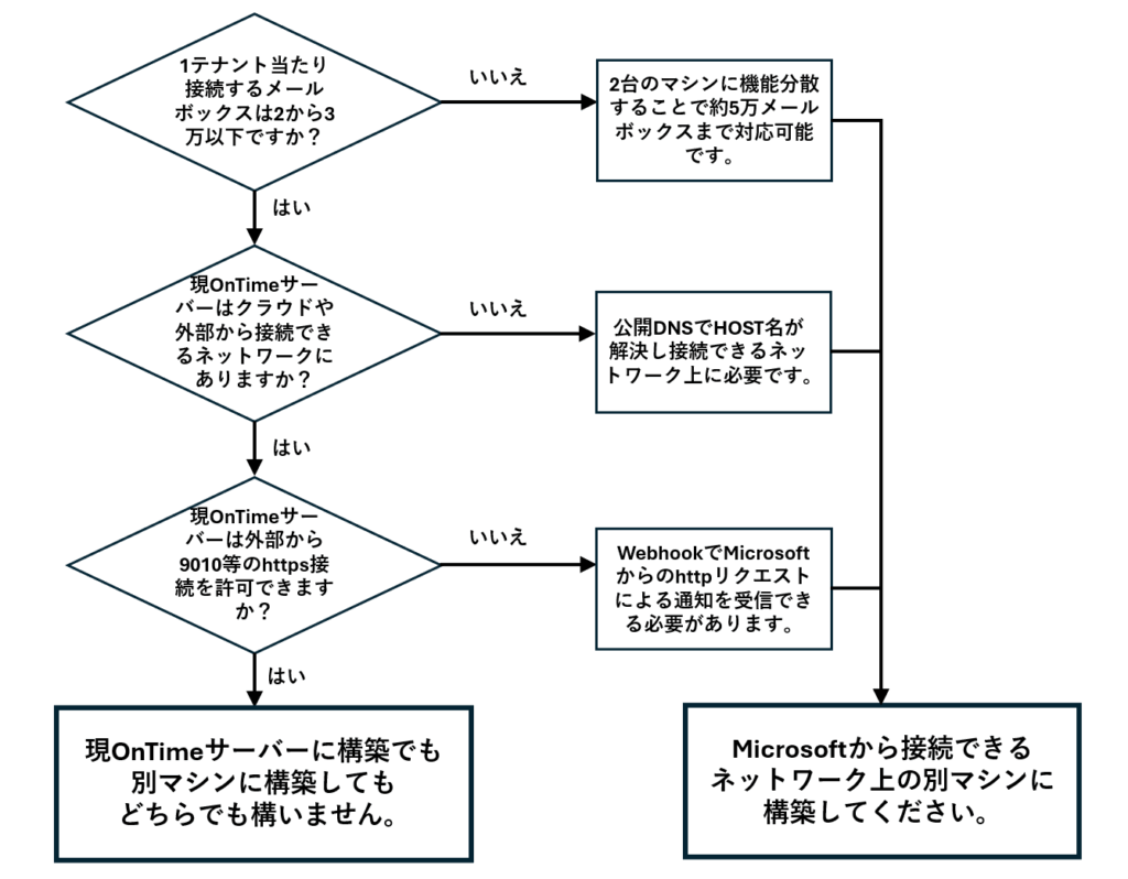 OnTime同期ハブをOnTimeサーバーと同じマシン上に構築するかどうかを、組織の状況に応じて以下のフローチャートで確認。
