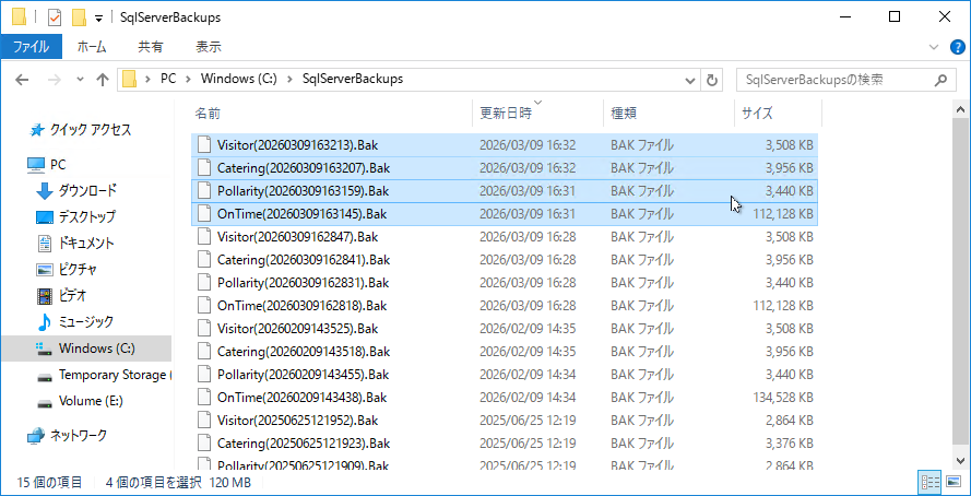 SqlServerBackupsフォルダに4つのバップアップファイルが作成されます。 - BAKファイルが4つ取得できたら、OnTimeを停止します。