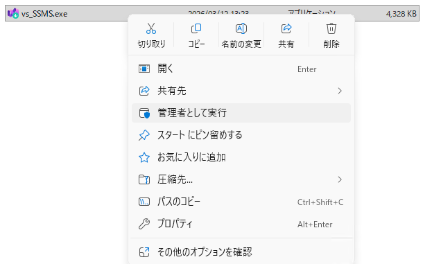 ダウンロードしたvs_SSMS.exeをマウス右ボタンメニューから「管理者として実行」をクリックします。