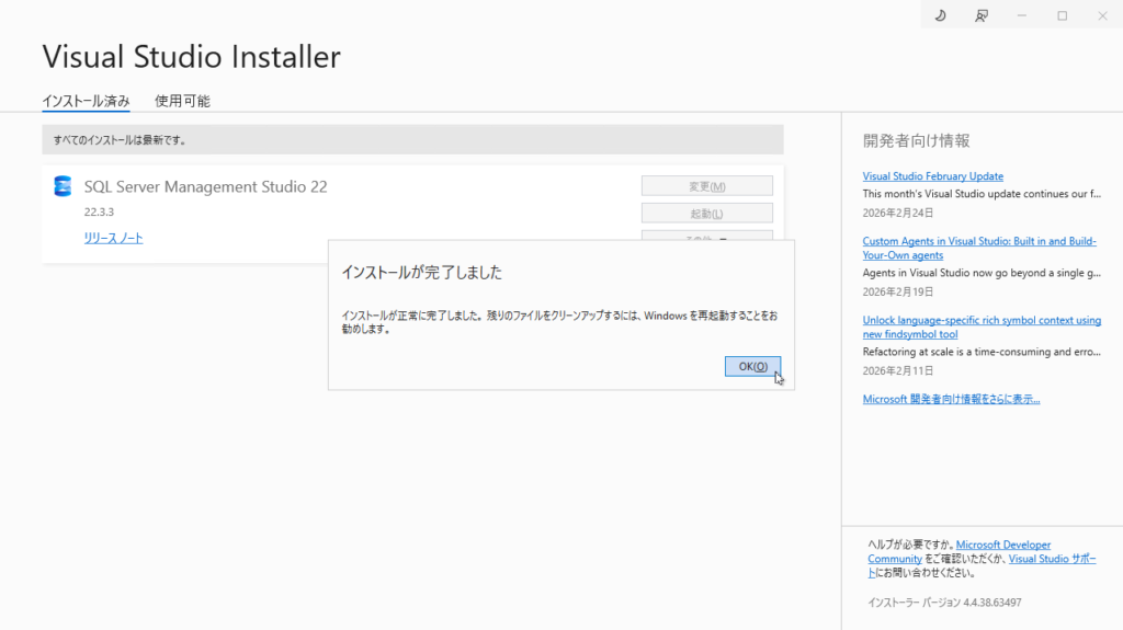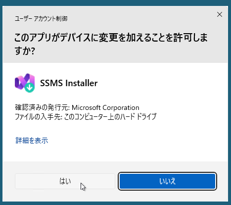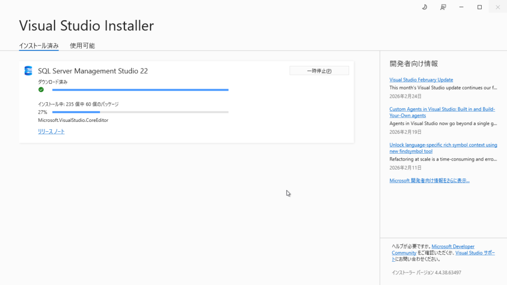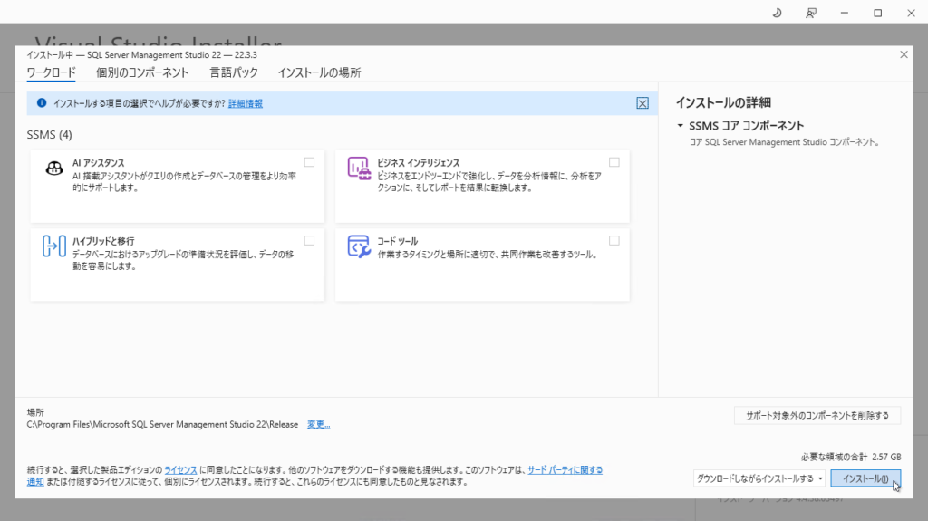 ダウンロードファイルはVisualStudioインストーラーで、Windowsの言語に合わせて(通常は日本語)、SQL Server Management Studioがインストールされます。