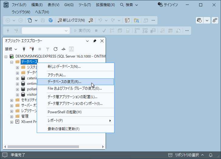 「データベース」を選択してマウス右ボタンメニューから「データベースの復元」を実行してください。