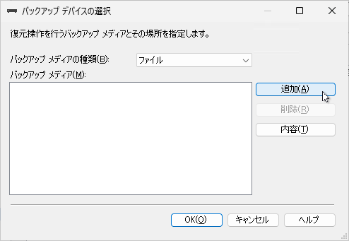 バックアップメディアの種類はファイルになっていることを確認して「追加」をクリックしてください。