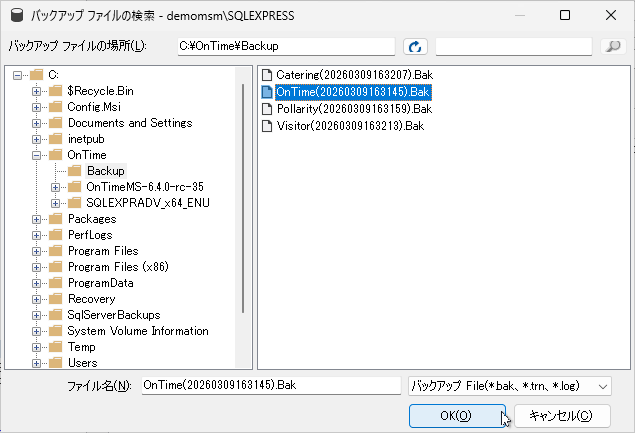 既存のOnTimeサーバーで使用しているSQL Serverのデータベースのバックアップファイルを準備します。