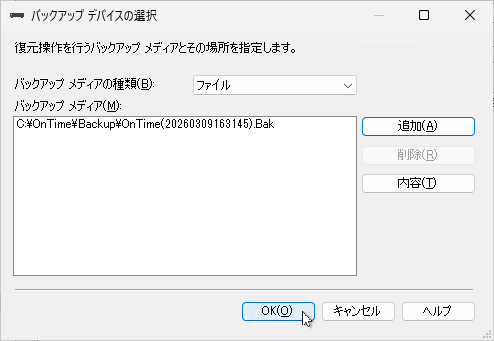 「バックアップデバイスの選択」画面では既存サーバーで作成したBAKファイルを選択します。