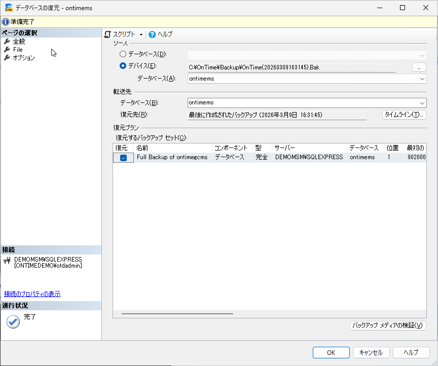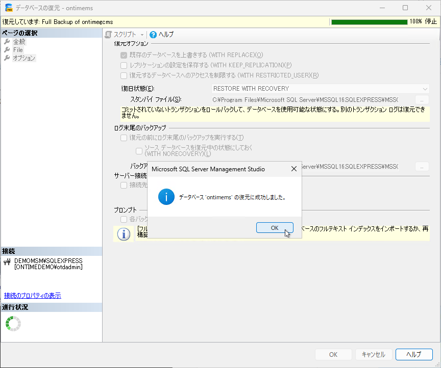 復元が完了すると「データベース’ontimems’の復元に成功しました。」と表示されれば完了です。「OK」を押してください。