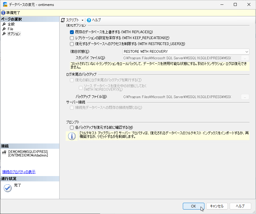 更に「オプション」を選択して「□既存のデータベースを上書きする」をチェックして画面右下の[OK]をクリックして復元を開始します。