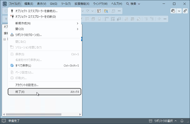 メニューの「ファイル」から「終了」を選択してSSMSを終了します。