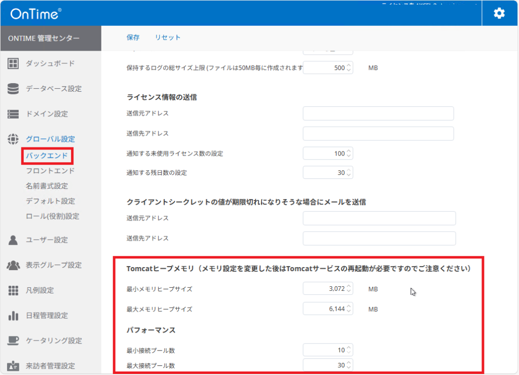 OnTime管理センターのバックエンドで新しいサーバーのスペックに適切なメモリに設定してください。