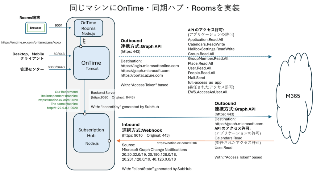 TLS証明書のpemファイルの配置とポート番号変更の設定について OnTime同期ハブは以下の2つから接続が行われます。 1.MicrosoftクラウドからのWebhookによるMicrosoft Graph の変更通知(Microsoft Graph Change Notifications) 接続のポート番号は変更でき...